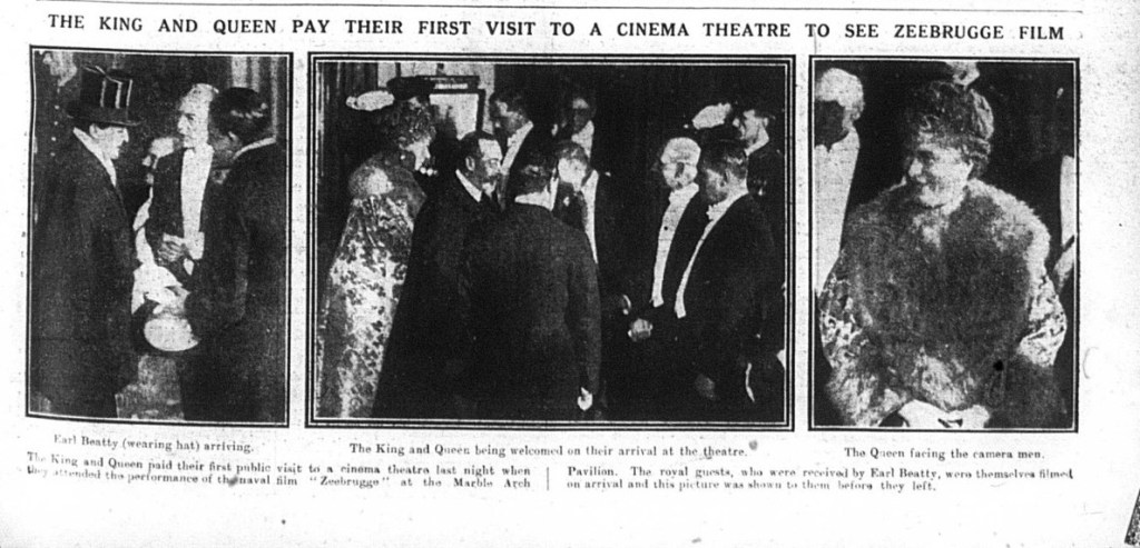 The King and Queen’s first public visit to a cinema came two years later, in November 1924 on the eve of Armistice Day. The occasion was a charity screening to raise money for the newly formed British Legion. The royal couple saw the non-fiction film Zeebrugge, which told the story of the British army’s attempt to close off the Belgian port of Zeebrugge during World War One. Again the event was covered extensively in the press.[3] Crowds cheered the Royal Couple as they arrived at the Marble Arch Pavilion and were shown to the Royal Box which was constructed for the occasion. Three commanders who had received Victoria Crosses for their bravery during the Zeebrugge Raid were also in the audience.