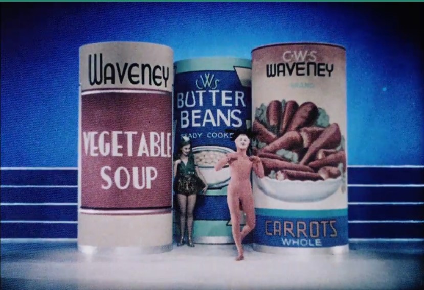 The film ends with a title card reading that ‘All the goods featured in this film are CWS products’ – but hardly any goods are featured with any prominence. The first housewife featured is shown unpacking products, and there are some shots of a full larder, but in either case it is not possible for the audience to easily identify what the products are. The only packages that are really clear are the three enlarged cans used as the set for the ‘Carrot and Onion’ dance. No foodstuffs are mentioned by name in any of the songs.